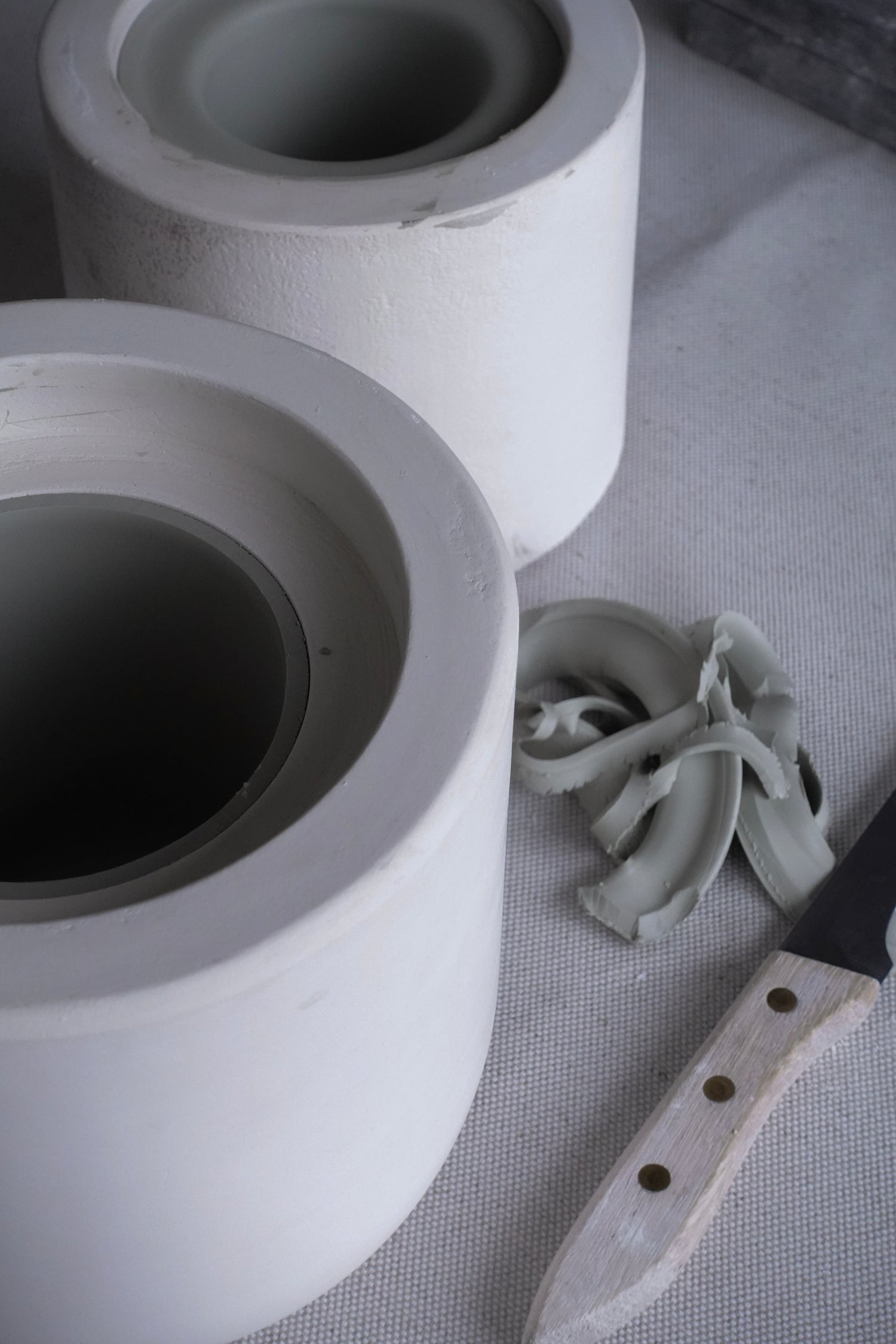Nous réalisons 100% de nos modèles en plâtre. Les formes circulaires sont réalisées au tour à plâtre tandis que les autres sont taillées sur le marbre à la main grâce à différents outils.